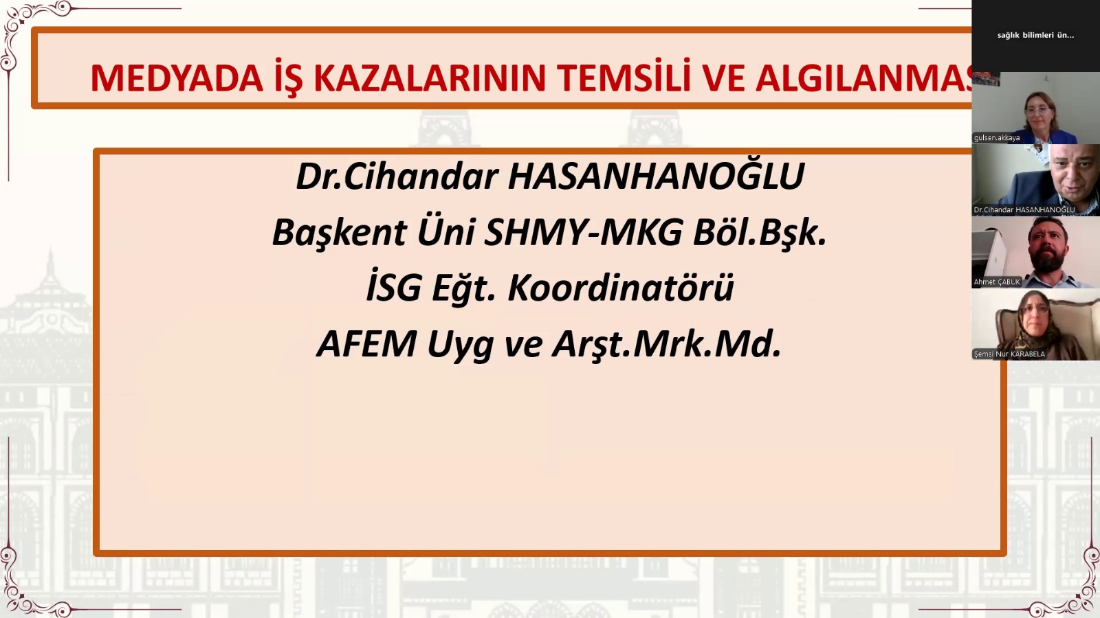 Sağlık Bilimleri Üniversitesi tarafından 7-8 Ekim 2025 tarihinde gerçekleştirilen Uluslararası Sosyal Bilimler ve İş Sağlığı & Güvenliği Kongresi'ne Öğr.Gör.Dr.Cihandar HASANHANOĞLU ; "Medyada İş Kazalarının Temsili ve Algılanması" ve "Tükenmişlik Sendromu, İşle İlgili Stres ve İş Kazaları" konu başlıklı bildirilerini sunmak üzere katılım sağlamıştır.